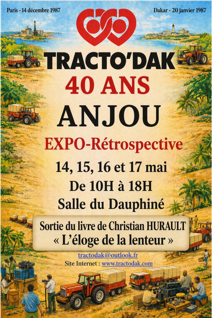 Du jeudi 14 mai (Ascension) au dimanche 17 mai, Tracto’Dak proposera une Expo-rétrospective de tous les voyages et toutes les actions menées depuis 40 ans. Le président prévoit pour le dimanche un repas africain avec le plat « signature » de Tracto’Dak, le Poulet Yassa.